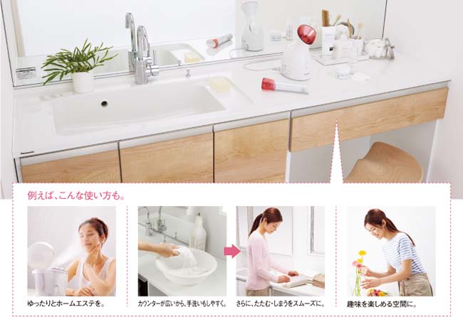 ドライヤーの仮置きや洗剤の詰め替えなごはもちろん、これまでにない洗面所の使い方がどんどん広がります。