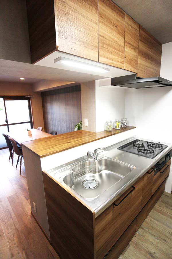 オープンキッチンに近いレイアウトを実現させる為、間仕切壁を壊し、広いカウンターを設け