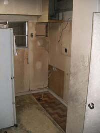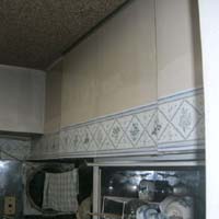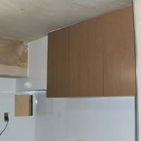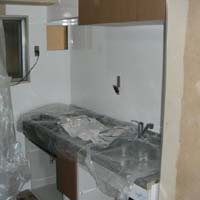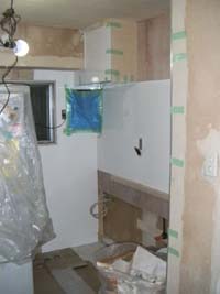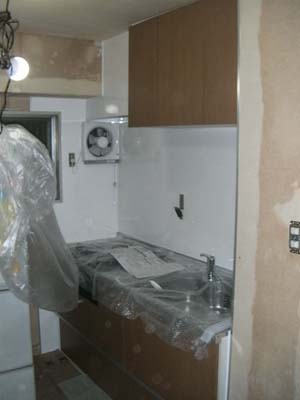 キッチン解体後、壁などの下処理。キッチンパネルを取付ます。
