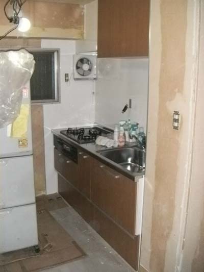 養生を取り外す前のキッチンの様子です。明るく、機能的なシステムキッチンに生まれ変わりました!