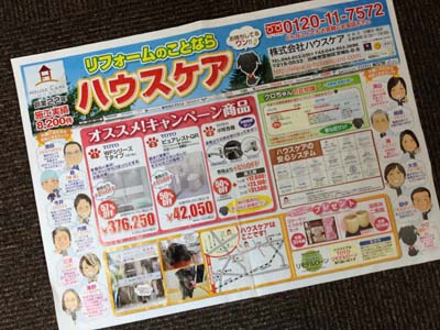 折り込み広告! 2013年8月23日 最終更新日時 : 2022年11月9日 staff こんにちは、ハウスケアの秦野です。 本日の朝刊に折込チラシを入れています。 おすすめキャンペーンしています。ぜひ、この機会にご利用ください。 三浦と秦野のイラストも初登場です。ぜひ、ご覧くださいね!