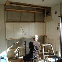 まずは既存のキッチンを撤去して、壁の下処理。ガスや水道の配管もダメージがないか確認します。