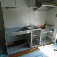 お手入れのしやすいキッチンパネルを貼り、キッチンを組み立てていきます。