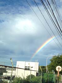 左は、雨上がりの「あま雲」の間にかかる虹。