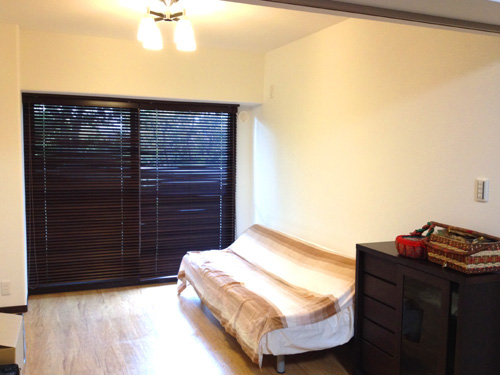 窓には重厚感あるダークブラウンの木製ブラインドを取り付け、アンティーク調の照明とともに、落ち着いた雰囲気のお部屋になりました。