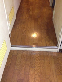 廊下は、床を無垢調のフロアタイル貼り、クロス貼替えました。玄関は、ベージュの石目調のフロアタイル貼り、廊下の床の色に合わせたの玄関框、ダークブラウンの巾木をつけました。