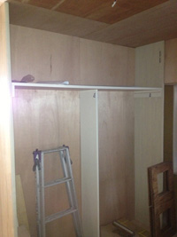カビの発生が悩みの種だった北側の洋室は、窓側の壁、床に断熱材を入れ、新規に造作した棚は通気を考えて、オープンに。2mほどあるハンガーレールは、収納力のオープンクローゼットになりました。