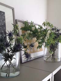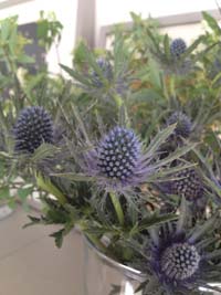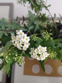 コデマリとアザミに似た青い花。飾らない素朴な美しさを感じるアレンジです。