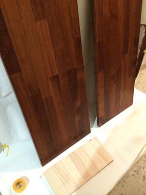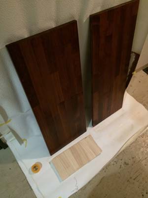 オイルステインを何度も塗り重ねて、色を出していきます。仕上げに、マットに仕上がる塗膜塗装を塗って、棚板の完成です。