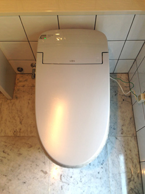 トイレ交換の工事の際には、元々隠れていた床が部分的に出てしまうので、施工の際にはクッションフロアなどを貼り替えるケースが一般的ですが、K様邸の床はこだわりの人造大理石貼り。人造大理石をそのまま使用したいとのご要望でしたので、施工に際しては、人造大理石が割れないよう、細心の注意を払いながら行いました。