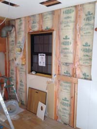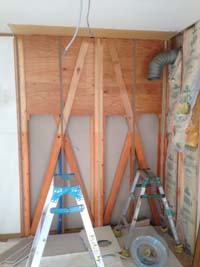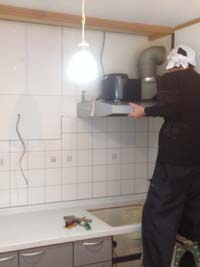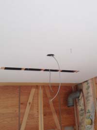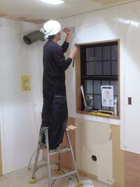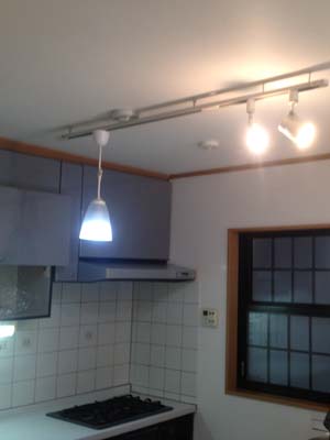壁・天井にクロスを貼った後に、LEDシーリングとスポット照明をつけるために、電気配線。キッチンを組立て、配管・電気工事をして完成です。