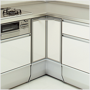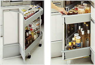 L型キッチンでデットスペースになりがりだったコーナー部分は、サッと引き出して使えるコーナーワゴンと、使用頻度の低い物を両サイドに収納するデルタトレーで、コーナーが頼れる収納スペースに。 お手入れもカンタンです。