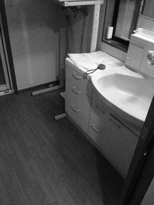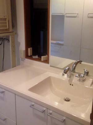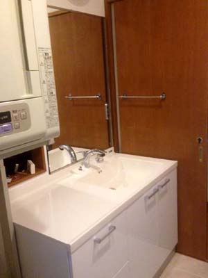 洗面所は、TOTOシステムJシリーズの洗面化粧台に取替え、天井・壁クロス貼り替え、床はクッションフロアを貼り、