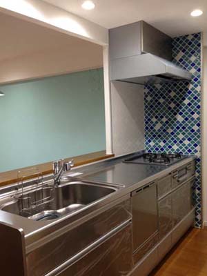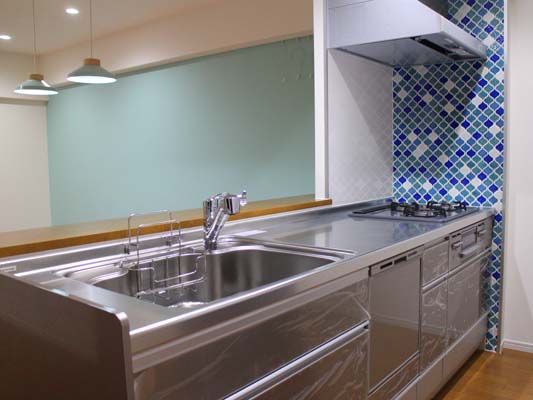 レンジ横壁のアクセントタイルは、名古屋モザイクのランタン風モザイクタイル・コラベル
