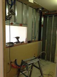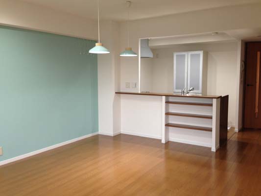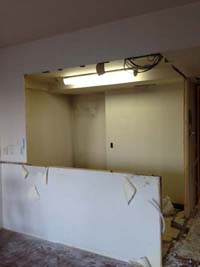 まずは解体作業。上吊戸がついていた上部壁面を撤去し、ダイニング側の壁をオープンにしました。