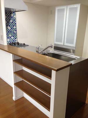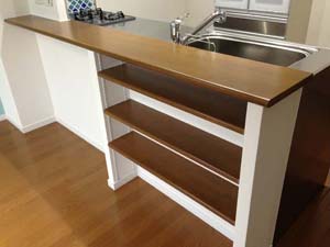 キッチンカウンターはイースタンオークの無垢材で造作。可動棚も取付け、収納としても飾り棚としてもお使いいただけます。