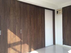 収納扉は、Panasonicのベリティス。ダークブラウンの木調パネルは、無垢材と見間違うほどで、高級感があります。