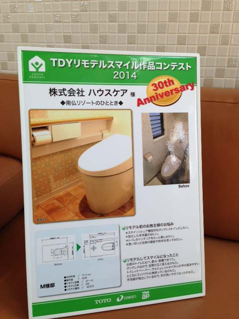 入賞パネル 2015年4月17日 最終更新日時 : 2022年11月9日 staff こんにちは、ハウスケアの秦野です。 先日、お話したTDYリモデルスマイル作品コンテストの入賞パネルが届きました。 1階ショールームに展示しています。お近くにお立ち寄りの先には、ぜひご覧ください!