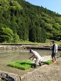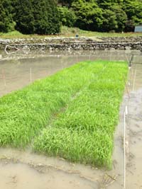揉み巻した稲床も青々した葉が出そろい、水をはった田んぼにうつされました。今月末からは田植えが始まります。