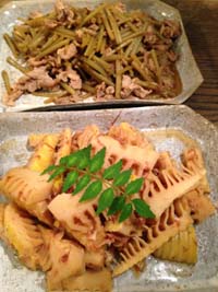 大きなお鍋3つ茹でて、筍ごはん・筍と鶏だんごの煮物・土佐煮を作りました。セリは茹でてお浸しに、フキは豚肉と甘辛く炒め煮して、春の味わいづくしの食卓です。