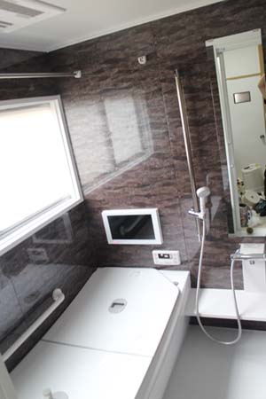ダークブラウンの浴室パネルは、シックで落ち着いた雰囲気です。
