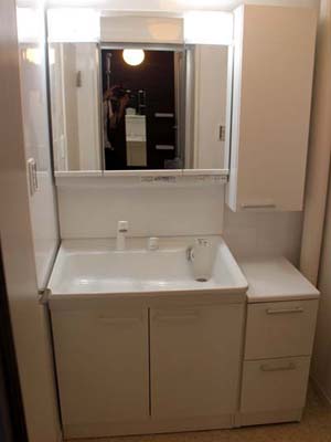 洗面所はシンプルな機能とデザインの洗面化粧台(TOTO Vシリーズ)と交換し、こちらの壁にもパネルを取け付け、湿気対策&メンテナンスしやすくしました。