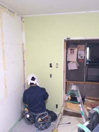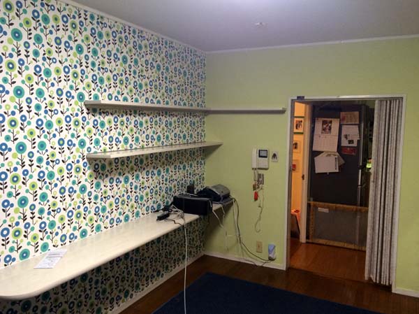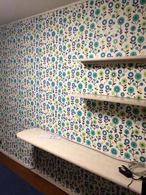 お施主様のこだわりは、一面をこのクロスを貼り、残りの三面はパウダーグリーン、天井は空をイメージしたブルーを選ばれたこと。