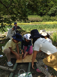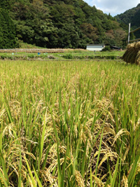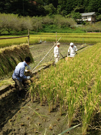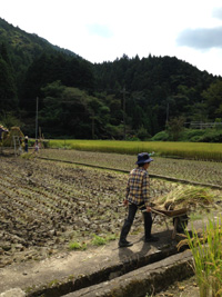 こどもと大人20人近くで作業。田んぼ3枚を刈り取りました。