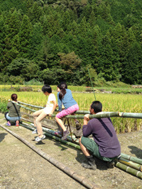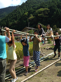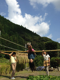 木に竹を縛り付け、竿の完成。こどもたちは、この竿を鉄棒にして、逆上がり!!