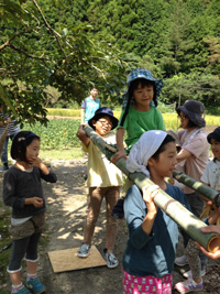 こどもたちだけで竹と木の板を切り、御神輿をつくっていました。