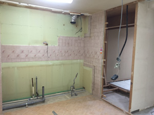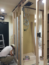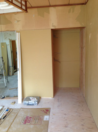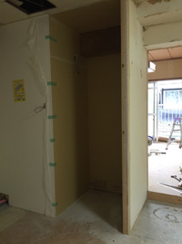 間仕切りの枠が立てられて、石膏ボードがはられると、リノベーションの枠組みも見えてきます。