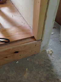 和室→洋室になる部屋には段差ができます。幅木、ドア枠、フローリングの取合いが難しく、大工さんと相談した箇所です。