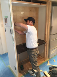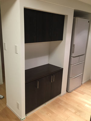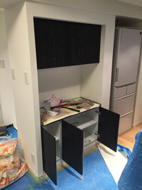 キッチン側に収納を取りつけていきます。