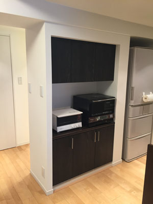 カウンターには、電子レンジとオーブントースターがぴたりと納まり、上下のキャビネットは収納量があるので、キッチンがすっきりとしますね。