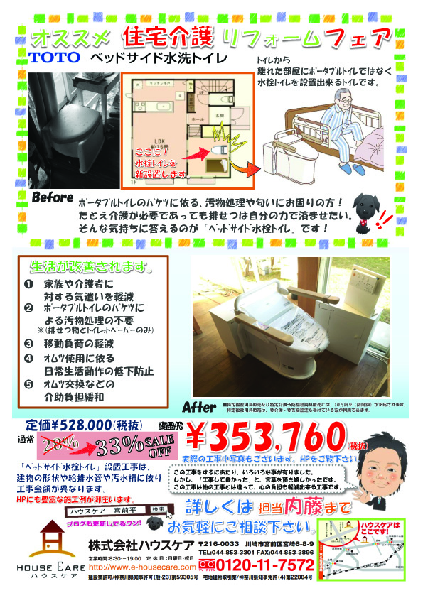 キャンペーン商品!! 2016年2月17日 最終更新日時 : 2022年11月9日 staff こんにちは、ハウスケアの秦野です。 先日ご紹介した水栓交換と、ベッドサイド水洗トイレのキャンペーンをご案内します。 通常価格よりも、さらにお得な割引でご提供します。 ぜひ、この機会をお見逃しなく!!