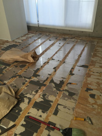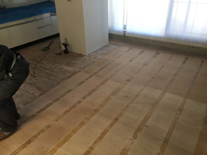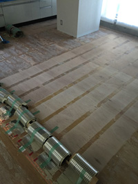 まずは、既存の床材を剥がし、床暖を撤去します。