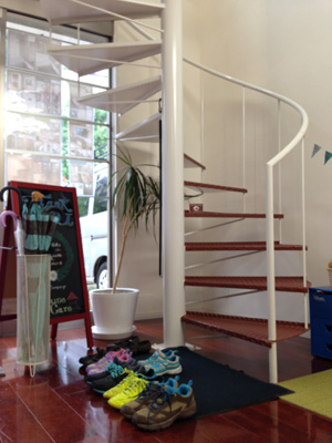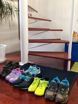 螺旋階段の下に並ぶ小さな運動靴。3年から6年生までの5人のこどもたちが取材にきてくれてましたよ。