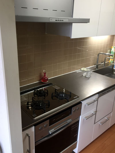 I型キッチンのパネルは白。シンプルですっきりとした印象です。