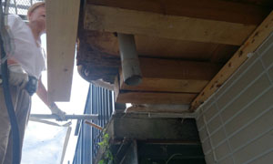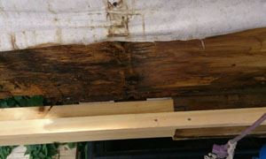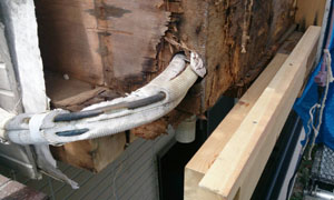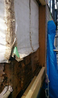腐食した外壁内部や木材部分を取り除き、新たに木部を組み直し、防水紙を貼り、サイディングします。