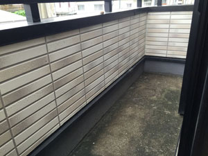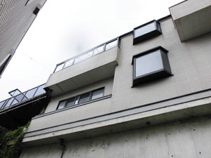 ベージュのタイル貼りの外壁の汚れが目立ちますが、一見ダメージを受けているようには見えません。