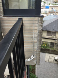 エアコンの室外機を結ぶパイプを差し込んだ外壁のシール(隙間を埋めるためのコーキング)が一部剥がれていることが確認できます。