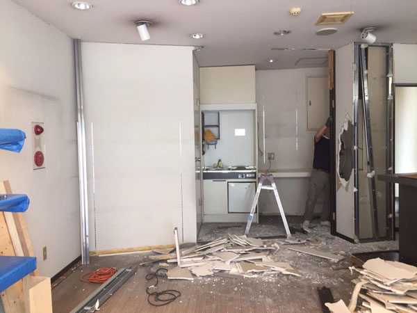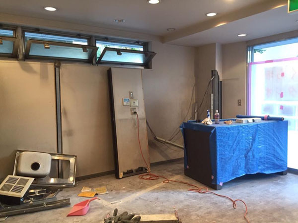 ウィンドウに養生が貼られ、解体工事がスタートです!