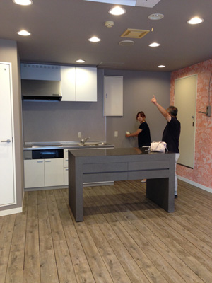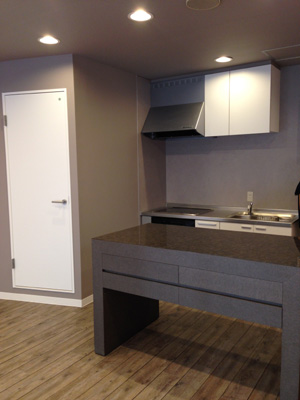 キッチン前のグレーのカウンターは、ブティックにもともとあったもの。