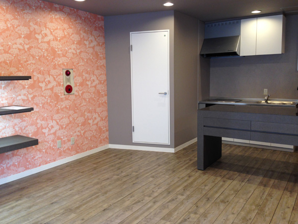 このさくら色のクロスをメインに、壁・天井はグレーの黒板クロス、床はヴィンテージ調のグレーのフロアタイル、キッチンや建具、トイレなどの設備は白の内装です。