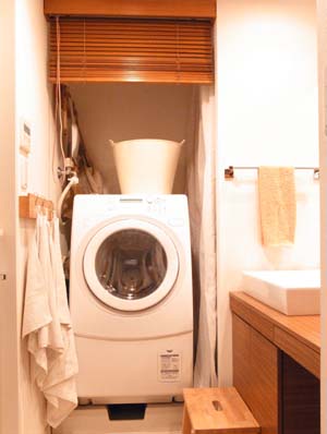 洗濯機の上に、洗濯かごがのっていたり、壁に掃除用品がかけてあったり・・・