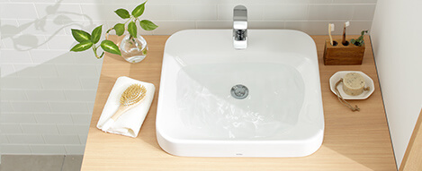 ベッセル式の陶器製洗面ボウルに、さまざまな形状・カラーのパーツを組み合わせて、暮らし方やトレンドスタイルに合わせた自分らしい洗面空間が実現できます。