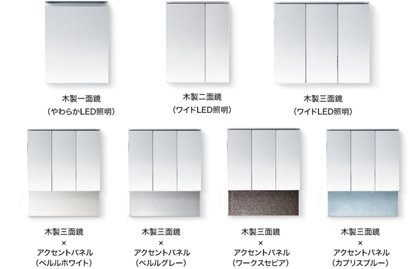 デザインや収納・使いやすさで選べる化粧鏡は、こだわりの洗面空間に応えられるバリエーションです。