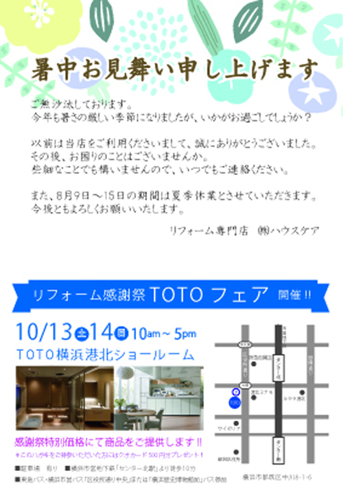 今年も、10/13,14に、リフォーム感謝祭として、TOTOフェアを開催します。