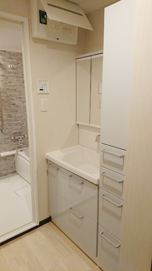 洗面所に収納力があると、洗濯物やちょっとした着替えができて便利です。