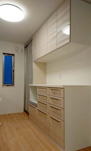 右側の収納は、細かく収納できる引き出しが多数付いたカウンターと、吊戸のキャビネット付きの収納。
